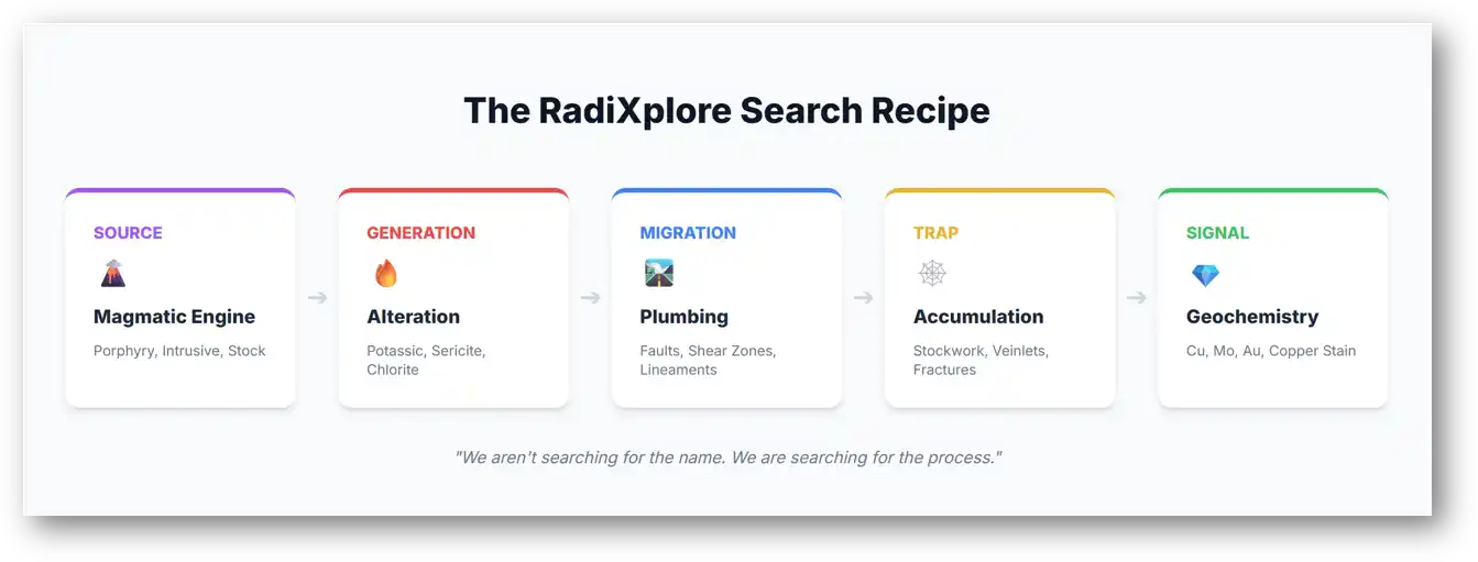 Instead of searching for commodity keywords, we searched for the ingredients of a porphyry system: