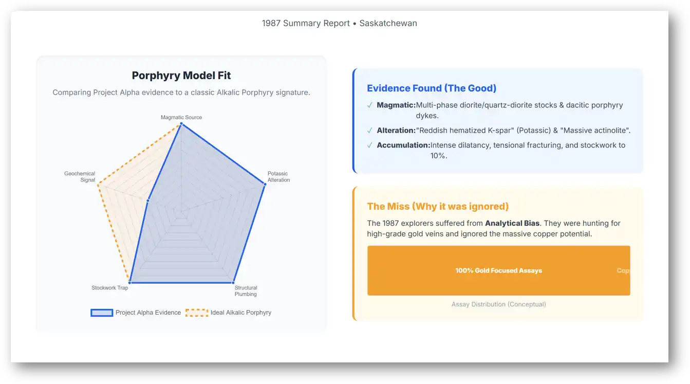 The historical "failure" of this project was entirely an economic/technical miss based on a gold-only bias, not a geological miss. The report describes a Dacite Porphyry intruding a Diorite Stock with Potassic Alteration and Disseminated Mineralization. This is the textbook "Signature" of an alkalic porphyry.