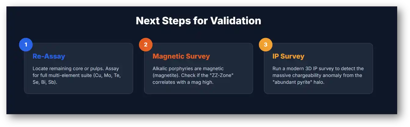 - Re-Assay: Locate any remaining core or pulps from the 1987 program and assay for a full multi-element suite (Cu, Mo, Te, Se, Bi, Sb).