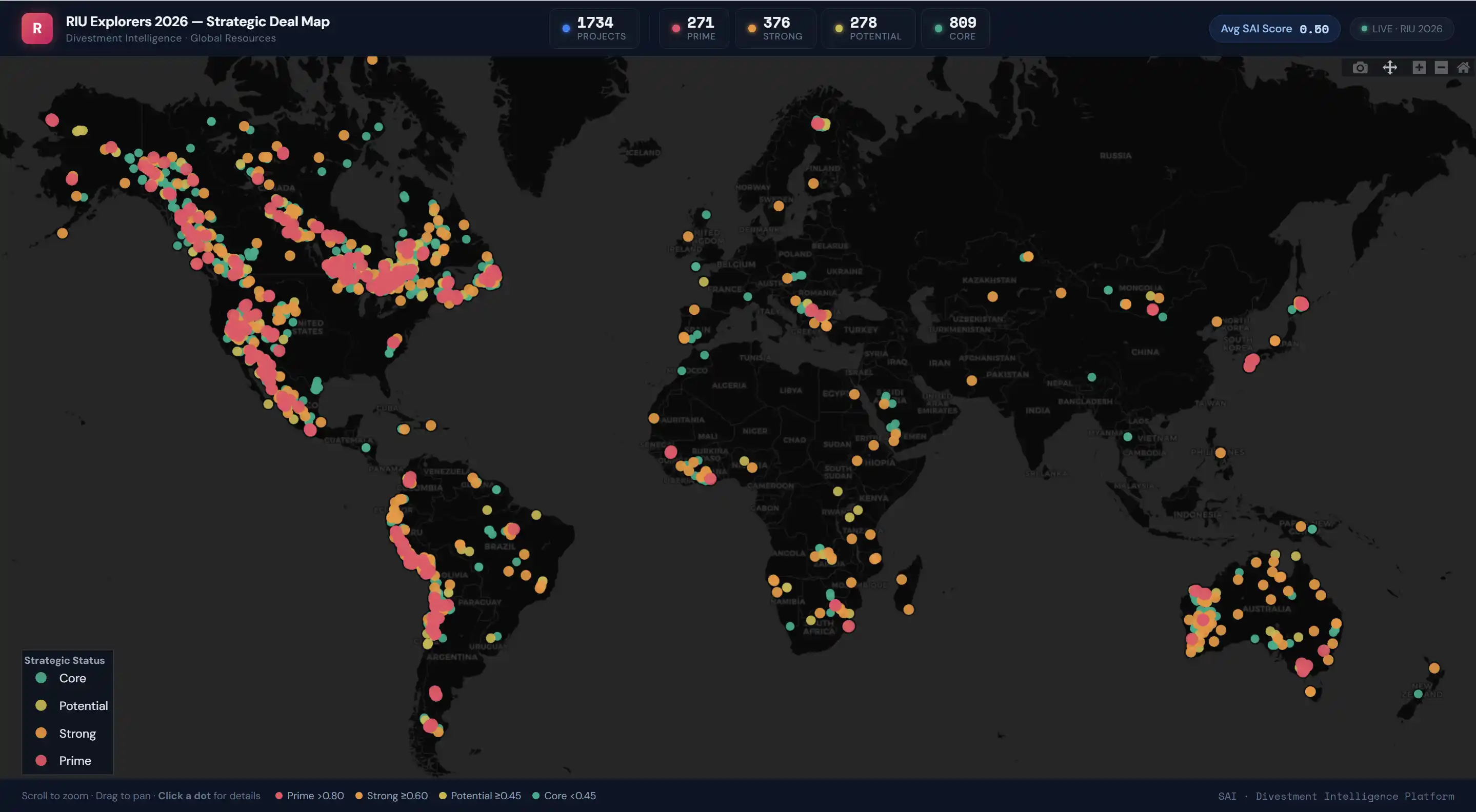 RadiXplore analyzed 1,734 projects at PDAC 2026 using its Strategic Asset Index, identifying 647 Prime and Strong mining M&A targets. Explore the interactive deal map and uncover divestment pressure, portfolio misalignment, and high-probability acquisition opportunities.