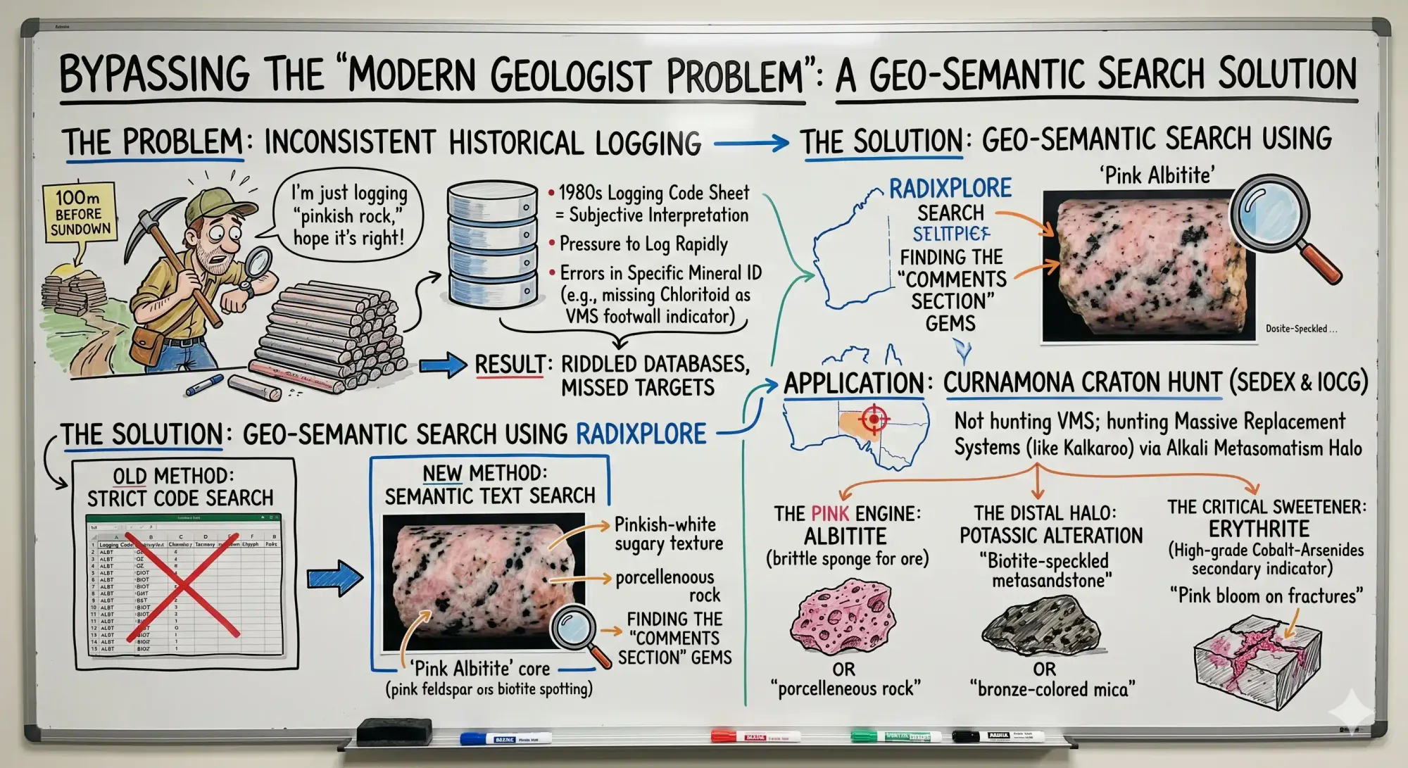 Millions of pages of historical exploration data in the Curnamona Province remain underutilized. By using AI-driven semantic search to map alteration systems-not commodities-we uncover overlooked IOCG and SEDEX targets hidden beneath cover.