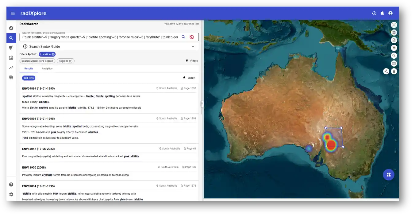 We built a specific NerdSearh query in RadiXplore to search across millions of pages of historical data. We didn't look for "copper assays." We looked for the language used by geologists describing the rocks in real-time.