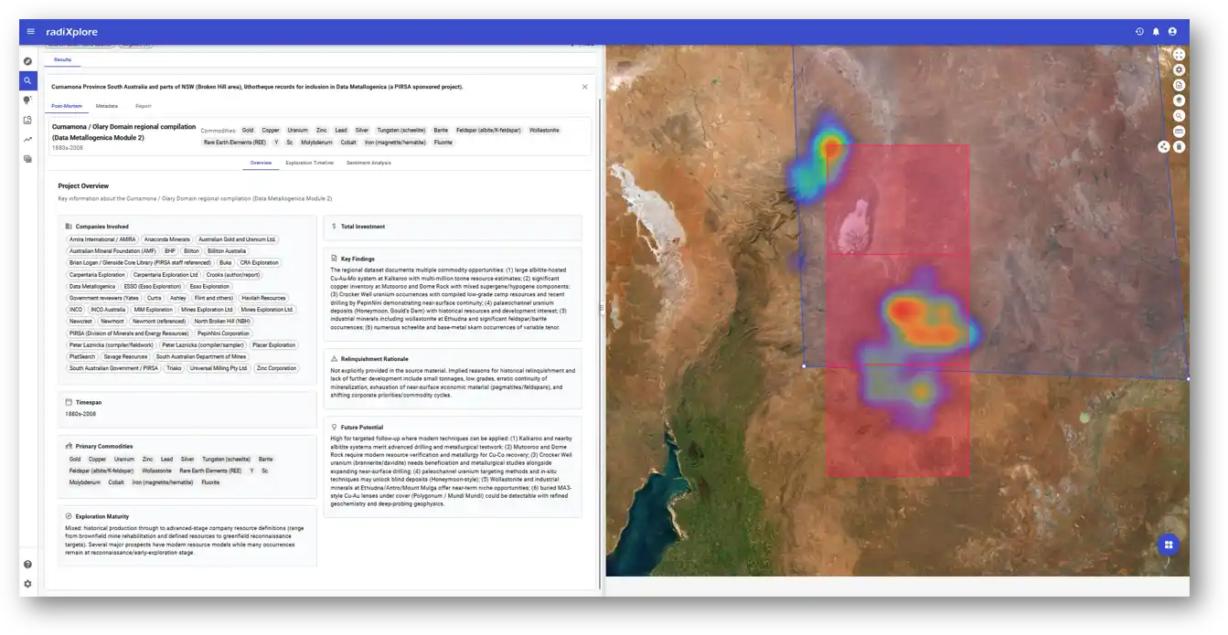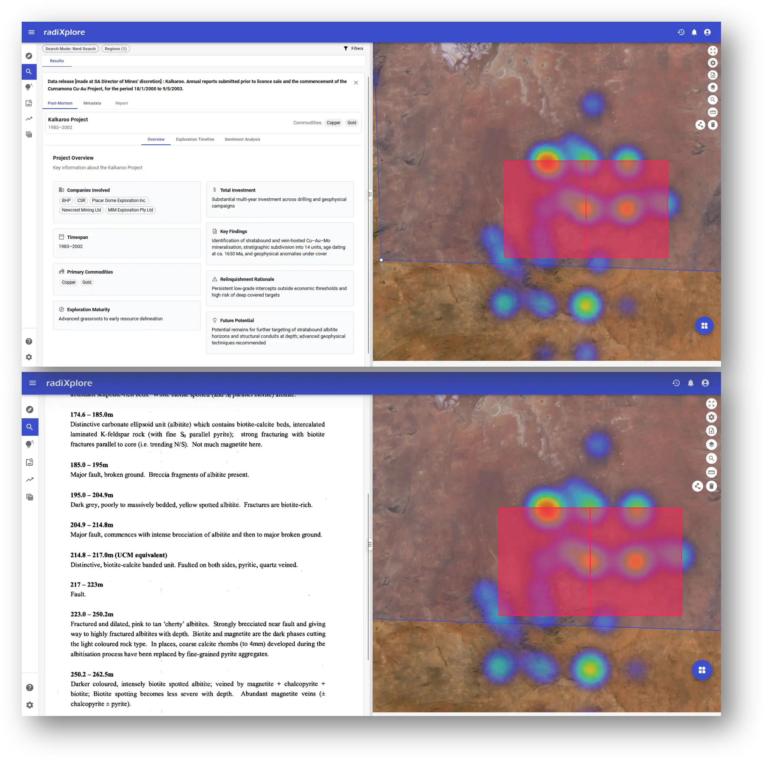 - The Postmortem Synthesis: Finding the right historical report is only half the battle; reading a 500-page scanned PDF takes days. RadiXplore's Postmortem feature instantly synthesizes these massive documents into structured, actionable intelligence. It automatically extracts the exploration timeline, the key technical findings, and most importantly, the relinquishment rationale. By summarizing exactly why a historical operator walked away, the Postmortem allows you to instantly identify the geological blind spots and near-misses that your competitors are walking right over.